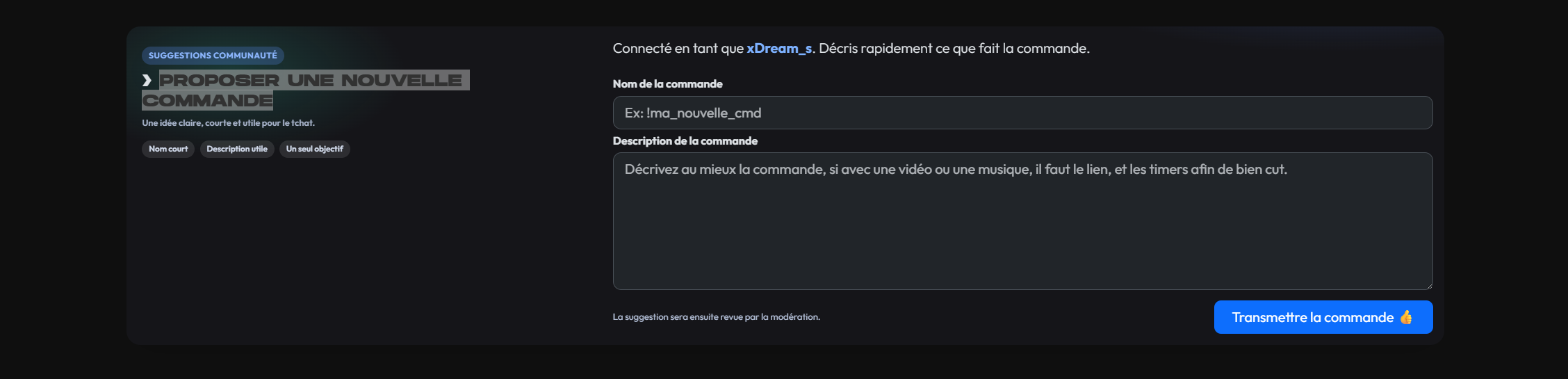 C'est le meilleur ajout, aussi bien pour vous que pour moi. Bien évidemment il faut être connecté, et c'est à partir de là que vous pourrez proposer votre commande que j'ajouterai au stream avec la commande de votre choix.