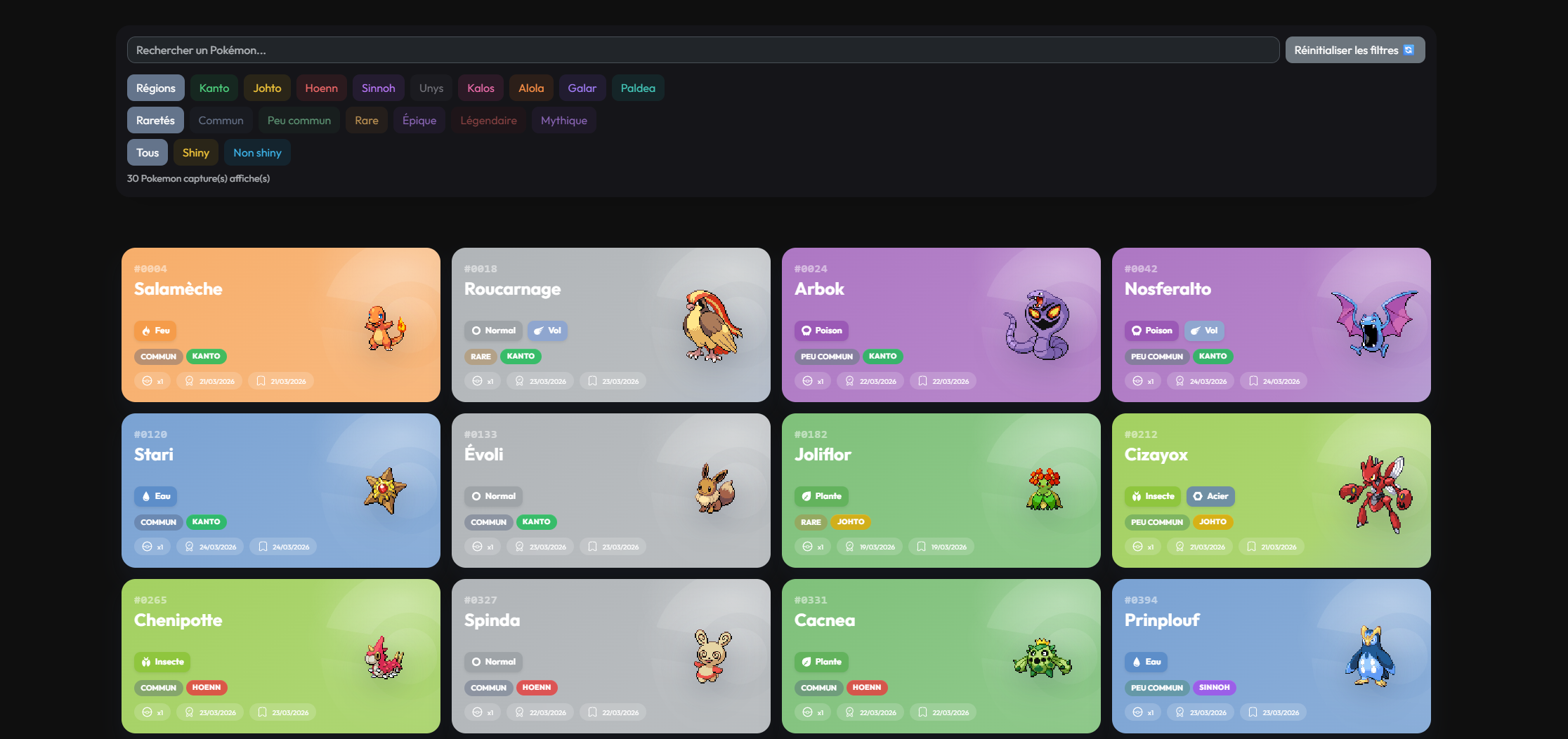 Toutes les régions sont disponibles, avec leurs raretés et si ce sont des Shiny ou non (via les filtres)