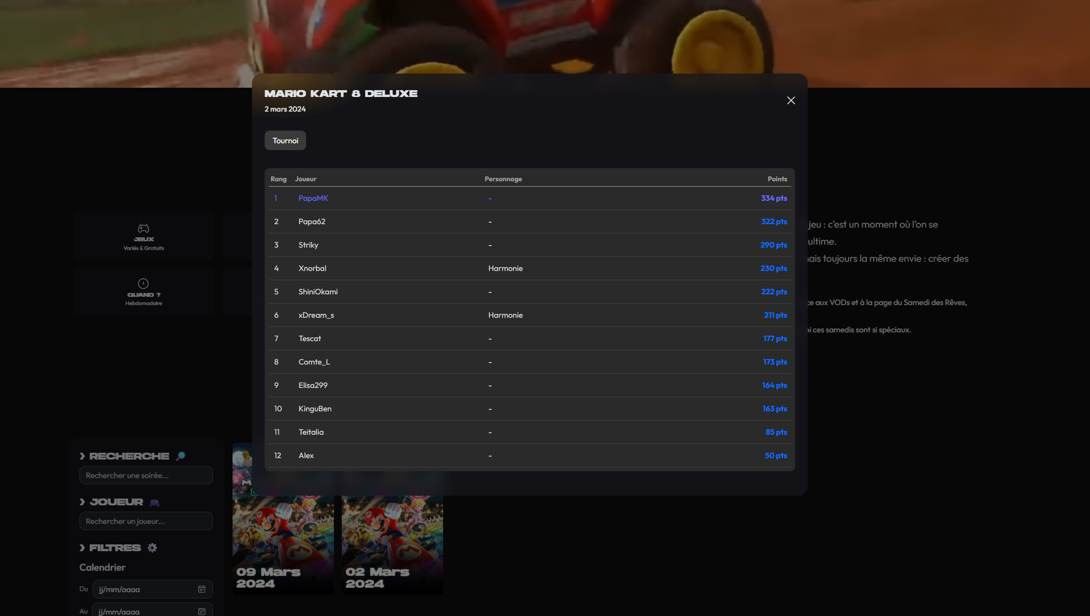 Les scores sont comme la Gameothèque, avec des fenêtres popup, afin d'afficher les informations de la soirée, si ça a été un Tournoi, un mode Survie ou Yoshi pour Mario Kart, mais aussi une soirée sur GeoGuessr, Among US, Wolfy et bien d'autres.